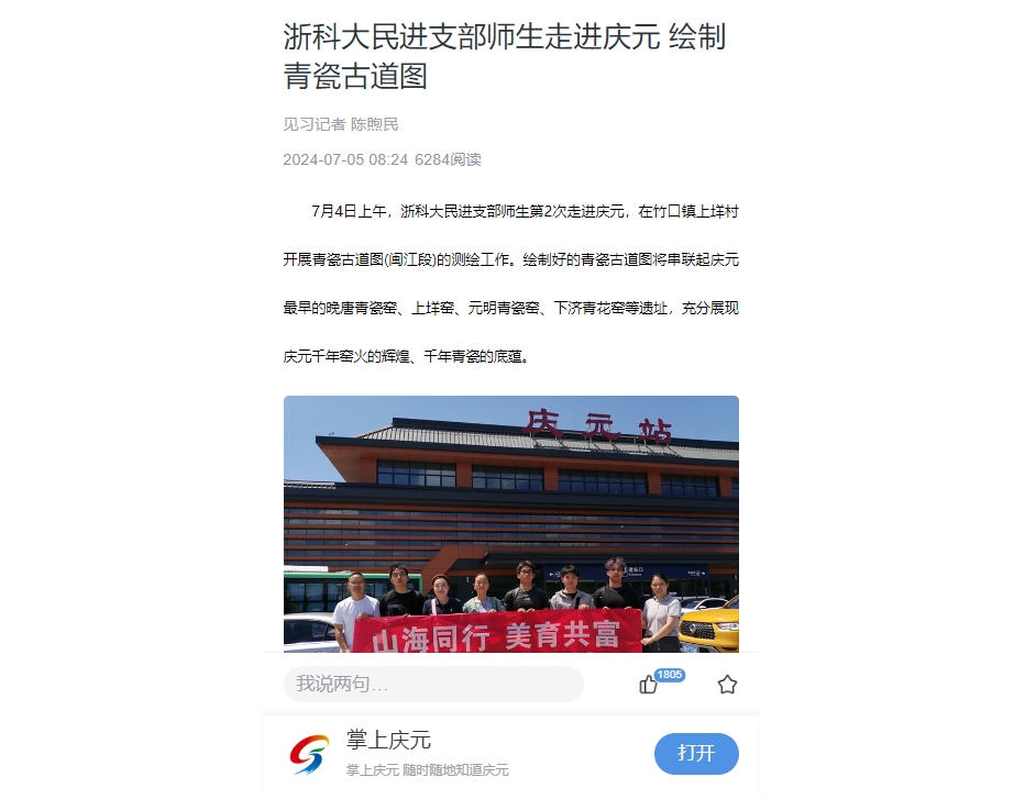 7月4日上午,浙科大民进支部师生第2次走进庆元,在竹口镇上垟村开展青瓷古道图(闽江段)的测绘工作。绘制好的青瓷古道图将串联起庆元最早的晚唐青瓷窑、上垟窑、元明青瓷窑、下济青花窑等遗址,充分展现庆元千年窑火的辉煌、千年青瓷的底蕴。