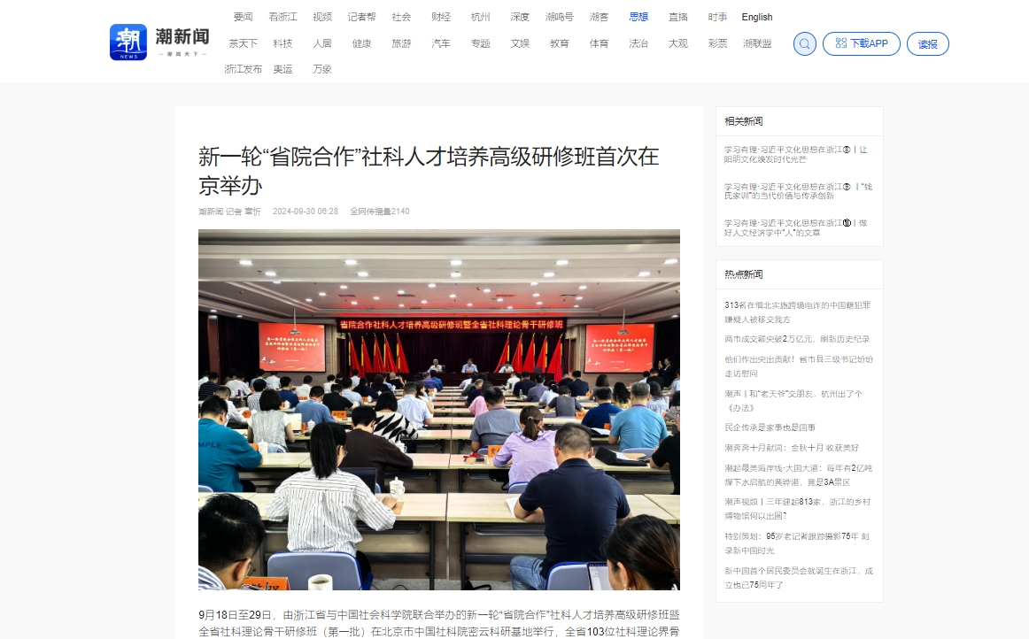 9月18日至29日,由浙江省与中国社会科学院联合举办的新一轮“省院合作”社科人才培养高级研修班暨全省社科理论骨干研修班(第一批)在北京市中国社科院密云科研基地举行,全省103位社科理论界骨干进行了为期12天的集中培训。