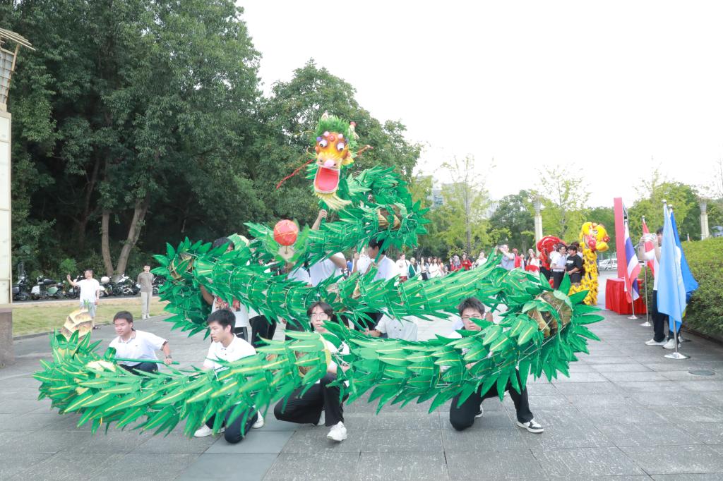 本届文化节以“四秩同心,‘德’伴同行”为主题,旨在庆祝学校中德合作四十周年,搭建文明互鉴之桥。开幕式上,威武雄健的醒狮表演与安吉校区非遗竹龙的灵动游走相映成趣,充分展现了中华传统文化的魅力与活力。国际学生带来的双人对唱、摩洛哥合唱与风情舞蹈串烧等节目轮番上演,将现场气氛推向高潮。在庄重的旗帜入场仪式上,127面生源国及社团旗帜汇聚成多彩的海洋。来自德国、越南等60多个国家(地区)的学生代表手持国旗依次登台。