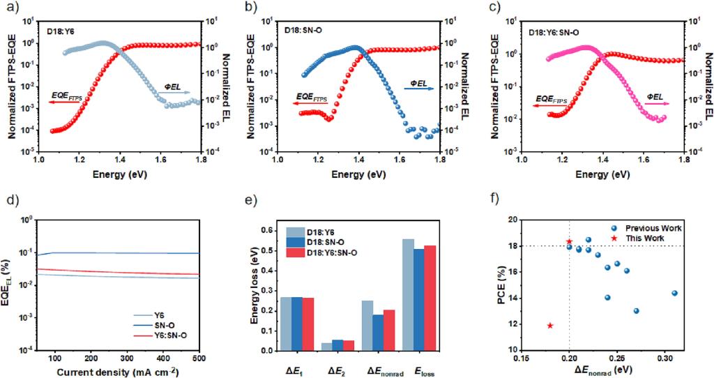 通过“双不对称策略”设计了一种新的不对称非富勒烯受体SN-O;SN-O表现出较大的偶极矩和上升的LUMO和HOMO能级;D18:Y6:SN-O三元体系的分子排列更加有序,结晶度增强,具有纤维状纳米结构。实现了0.202 eV的低非辐射能量损失,这是PCEs超过18%的基于D18的OSCs的最低值之一。(生化学院  蒋成君 )