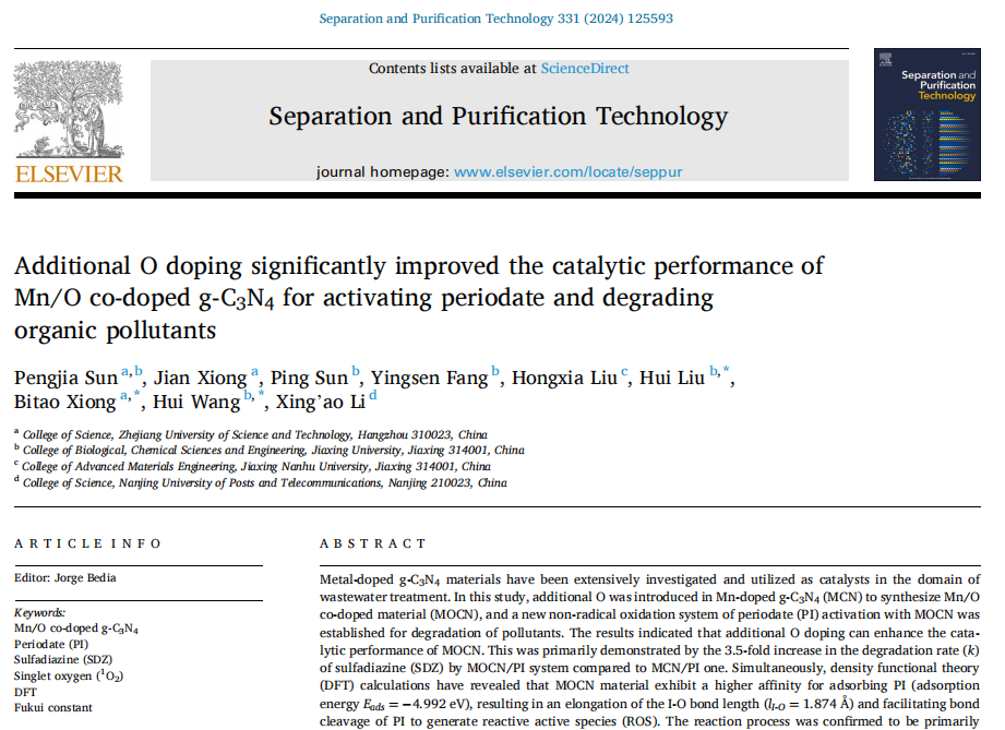 近期,理学院量子关联物质研究团队在“额外O掺杂显著提高Mn/O共掺杂g-C3N4活化高碘酸盐降解有机污染物的催化性能”研究中取得重要进展,研究成果以论文形式发表在国际期刊《Separation and Purification Technology》,论文题目为“Additional O doping significantly improved the catalytic performance of Mn/O co-doped g-C3N4 for activating periodate and degrading organic pollutants”。理学院物理学硕士研究生孙鹏佳为该论文的第一作者,理学院副教授熊必涛为该论文的通讯作者,浙江科技学院为第一单位。本研究由浙江省自然科学基金、国家自然科学基金支持。