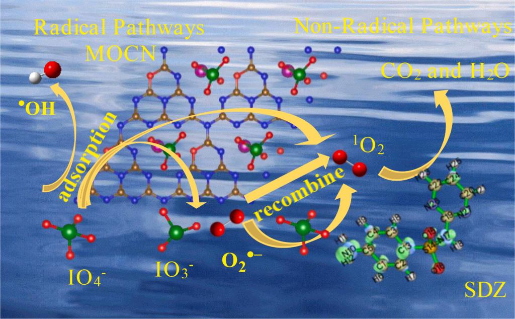 本文通过在Mn掺杂g-C3N4(MCN)材料中引入额外的O元素,制备了共掺杂材料MOCN, 可以显著提高磺胺嘧啶(SDZ)的降解,其速率是MCN的3.5倍。进一步的密度泛函理论(DFT)计算结果表明,这可能是因为高碘酸盐(PI), 吸附能Eads =−4.992 eV, 比其他氧化剂更容易被MOCN吸附,导致其I-O(lI-O = 1.874 Å)键长延长,更容易断裂。同时,I-O键的裂解产生了非自由基1O2是MOCN/PI氧化体系中的主要活性物种。该系统在模拟水体和真实水体中均表现出良好的抗干扰性能和稳定性。此外,还提出了SDZ可能的降解途径,并通过计算SDZ的Fukui常数进行了验证。本文提出了新型MOCN/ PI体系在处理水污染处理方面具有巨大的潜力,为进一步研究基于PI的高级氧化技术(AOPs)提供了参考。(理学院 孙婷婷)